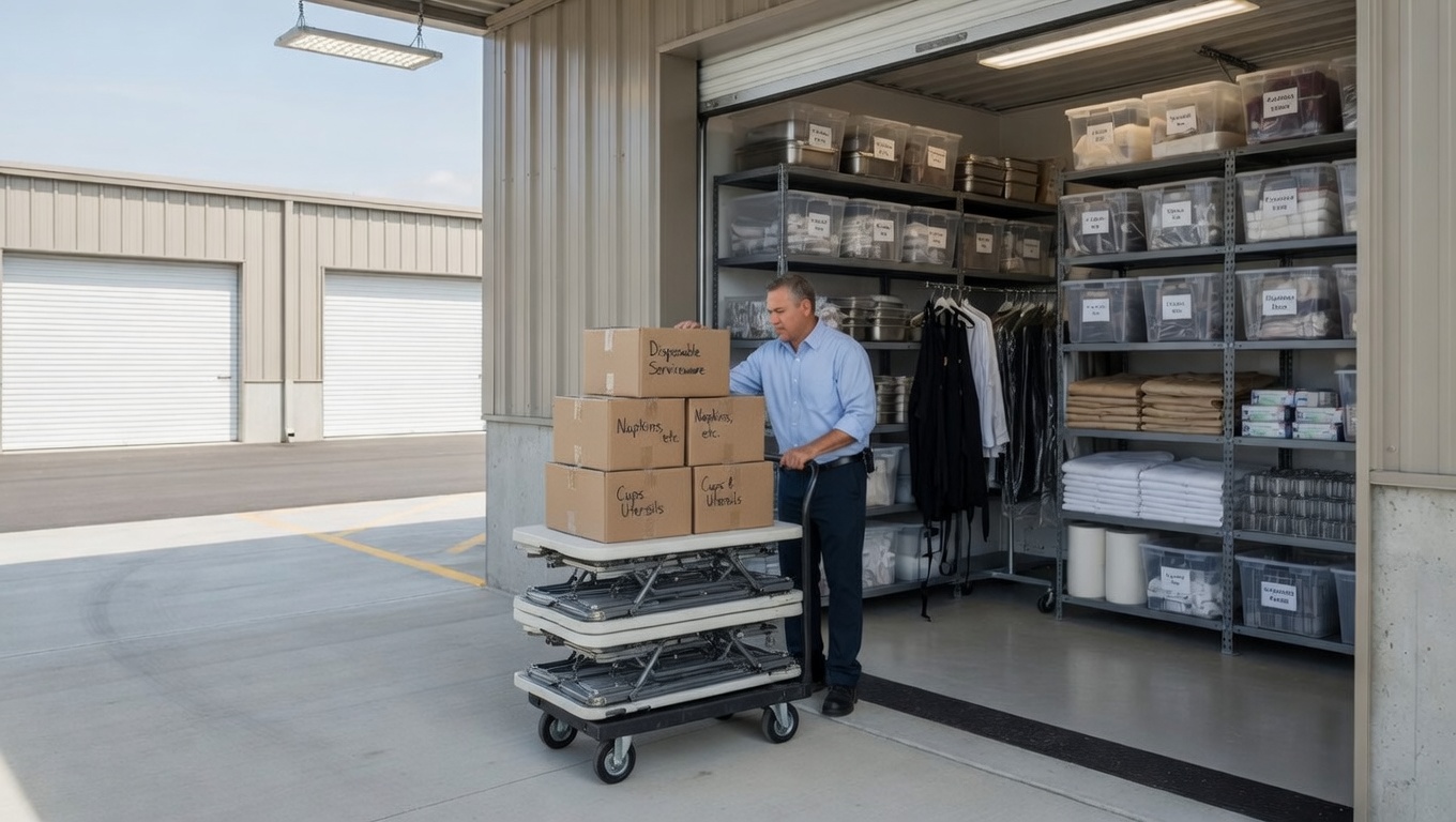 Off-premise catering is a significant and growing revenue stream for many restaurant operations, but the equipment it requires — chafing dishes, serving platters, portable warming units, linens, event tents, tables, and specialty smallwares — is bulky and sits idle most of the time. Keeping it on-site means it is always in the way. Keeping it in a nearby, drive-up accessible offsite storage unit means it is organized, protected, and ready to load when an event is booked.